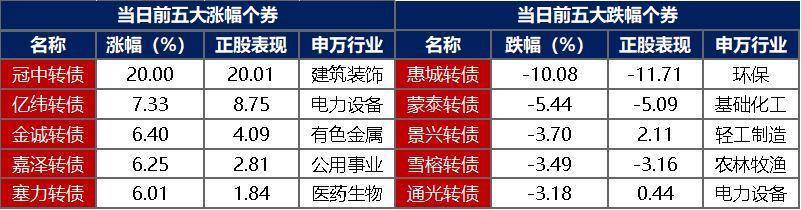 【转债市场主要指数集体跟涨】 9月30日,转债市场跟随权益市场继续走强,当日中证转债、上证转债、深证转债分别收涨0.69%、0.58%、0.85%。当日,转债市场成交额803.16亿元,较前一交易日缩量25.48亿元。转债市场大多上涨,430支转债中,312支收涨,98支下跌,20支持平。当日上涨个券中,冠中转债继续涨停20%,亿纬转债涨超7%;下跌个券中,惠城转债跌逾10%,蒙泰转债跌逾5%。