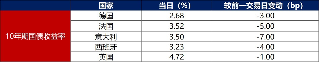 10月8日,主要欧洲经济体10年期国债收益率普遍下行。其中,德国10年期国债收益率下行3bp至2.68%,法国、意大利、西班牙、英国10年期国债收益率分别下行5bp、7bp、4bp和1bp。