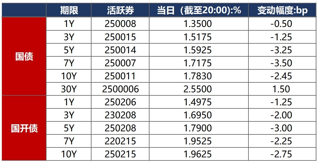 9月30日,市场再度传出央行可能重启国债买卖操作的消息,交易情绪随之升温,加之资金面平稳,债市整体回暖。截至北京时间20:00,10年期国债活跃券250011收益率下行2.45bp至1.7830%,10年期国开债活跃券250215收益率下行2.75bp至1.9625%。