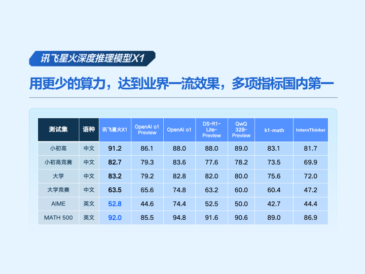 讯飞星火X1展示出了强大的深度推理能力。通过解答高考题、AIME竞赛题以及高中奥赛题,讯飞星火深度推理模型X1不仅准确给出了答案,还对解题思路和步骤进行了详细拆解。其解题过程更接近人类的“慢思考”方式,充分展现了深度推理模型的三大典型特征:化繁为简,将复杂问题分步拆解简化;进行自我探索和反思验证;基于答案正确与否的优质反馈信息进行强化训练。在多项“考试”中,讯飞星火深度推理模型X1用更少的算力实现了业界一流的效果,多项指标国内第一。这一成绩不仅证明了讯飞星火X1在深度推理能力上的卓越表现,也彰显了科大讯飞在AI技术上的深厚底蕴。